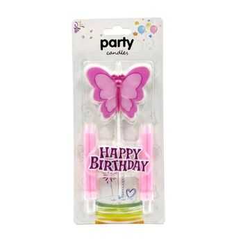 Paket İçerisinde 1 Adet 7x6cm Boyutunda uzunluğu 15cm Olan Kelebek Şekilli Mum 4 Adet 8cm Boyutunda Pembe Mum 1 Adet 6x3 cm Boyutunda Happy Birthday Yazı Bulunmaktadır.