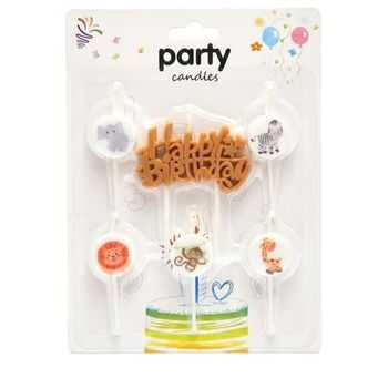 Paket İçerisinde 1 Adet Happy Birthday Yazı ( 7x4 cm ) 5 Adet (2x6 cm) Safari Hayvanları Pasta Mumu Bulunmaktadır.